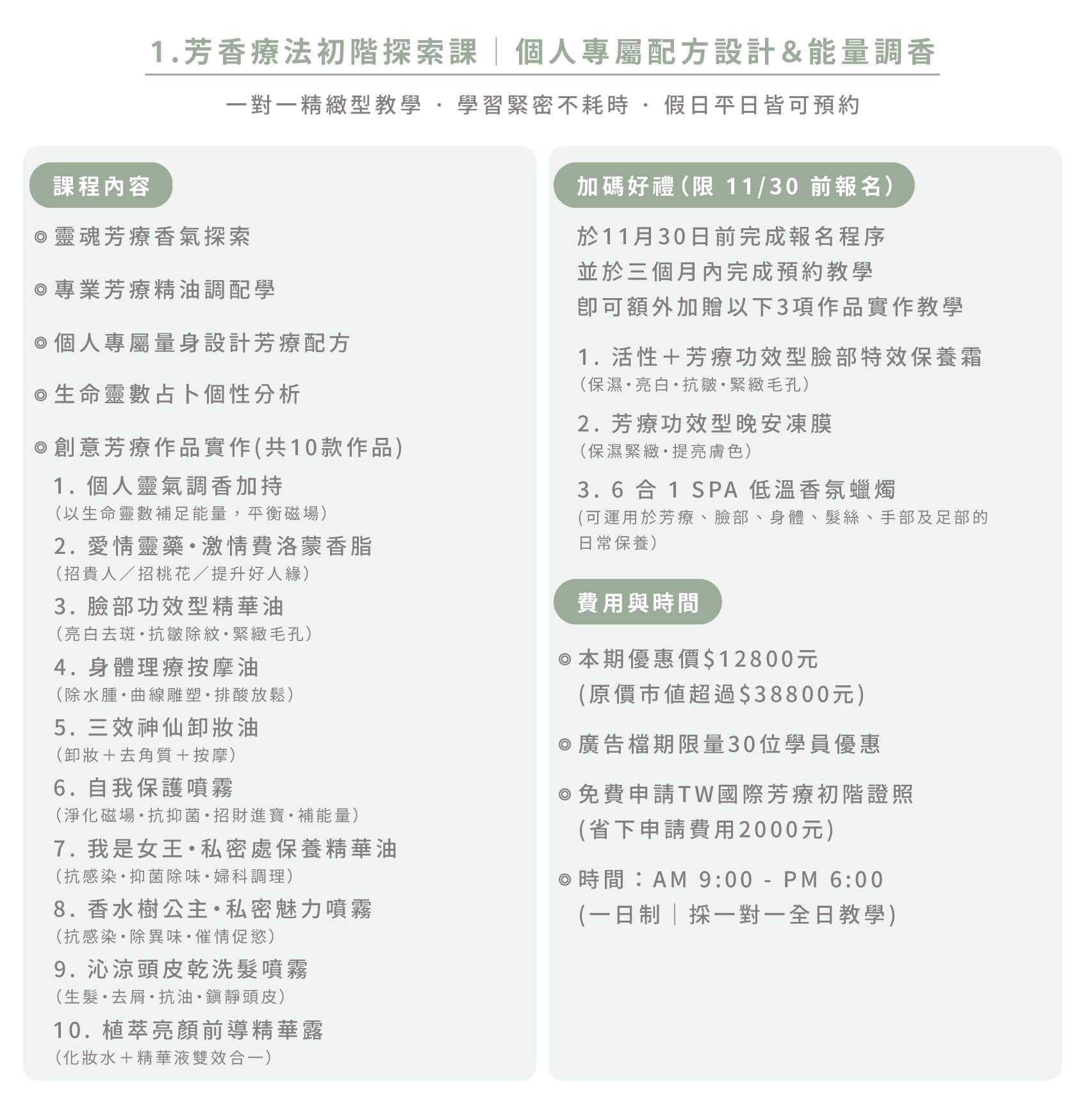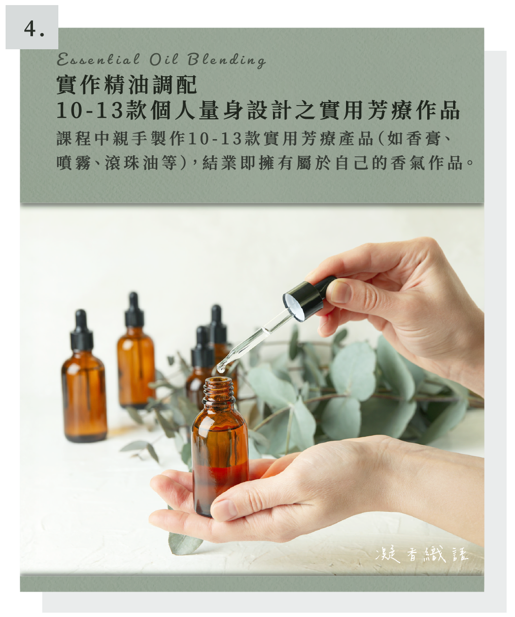 一對一教學,課後帶回 10 - 13 款芳療功效型配方作品