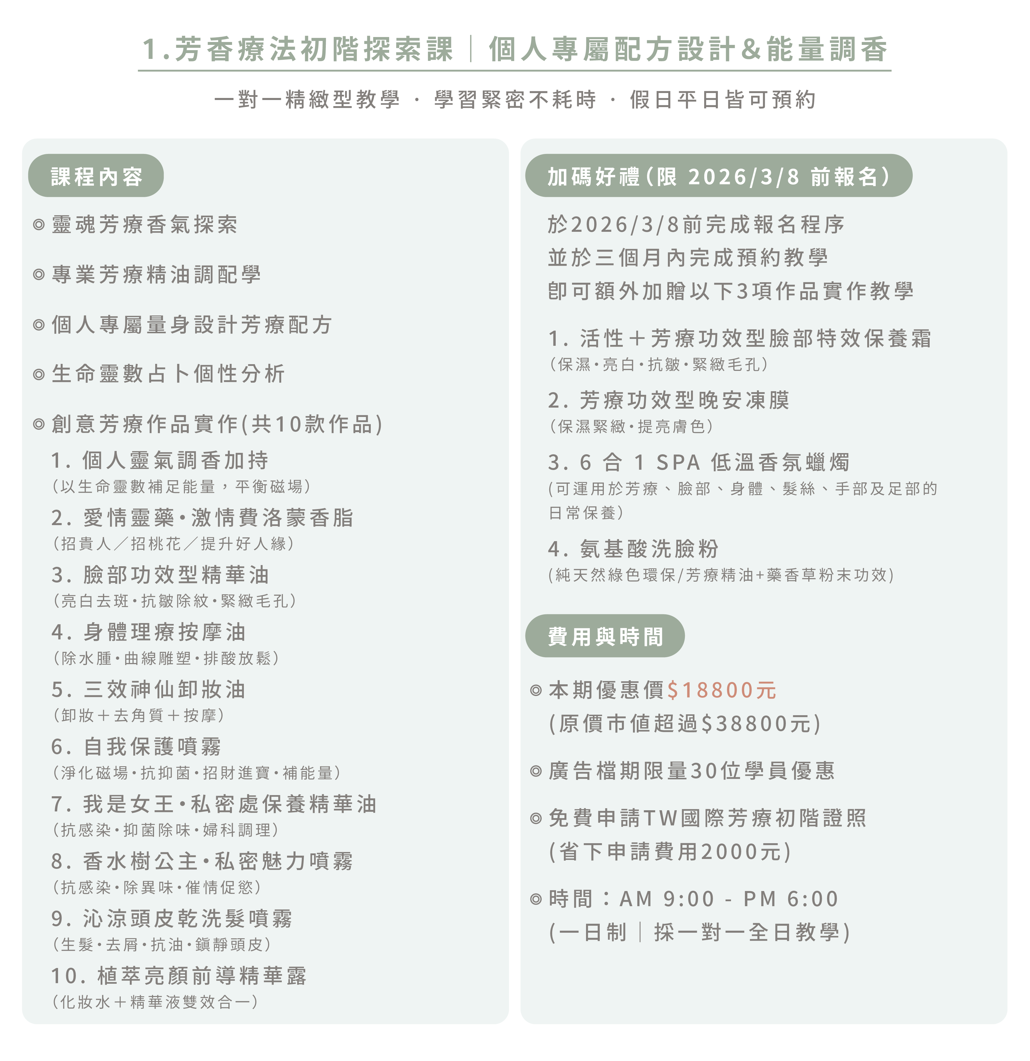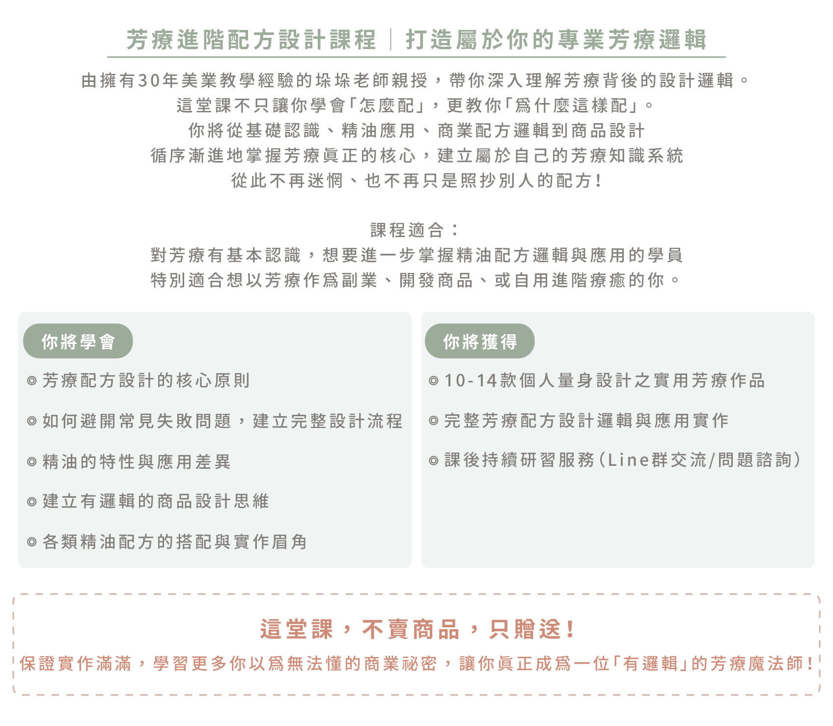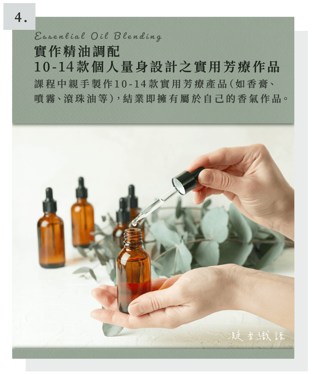 一對一教學,課後帶回 10 - 14 款芳療功效型配方作品